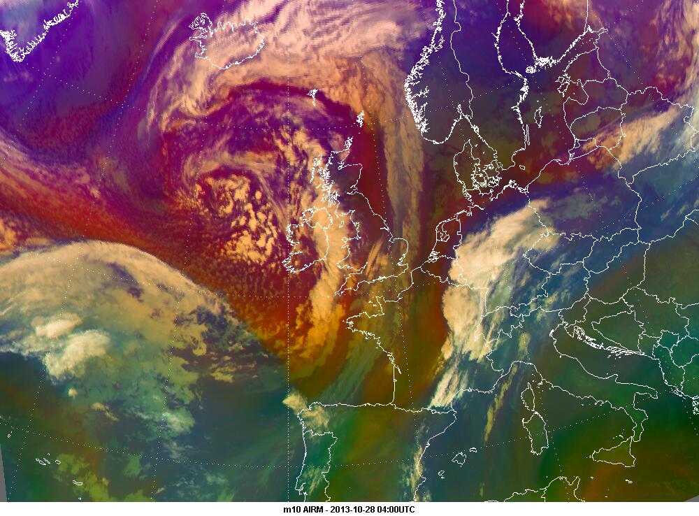 The airmass RGB imagery shows a massive outbreak of cold air over the eastern Atlantic causing the strong development of a depression over western Europe, resulting in violent winds. In the imagery the white cold frontal cloud band of storm St Jude can be seen extending from south-western England across the Channel in to the Gulf of Biscay and beyond. The red colour in its rear marks a very strong intrusion of dry stratospheric air that gave rise to the heavy precipitation and winds where the cold front was passing.